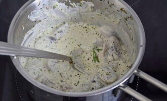 - Giet vervolgens de room erbij, breng aan de kook, voeg de gehakte kruiden toe, dek af en haal onmiddellijk van het vuur.