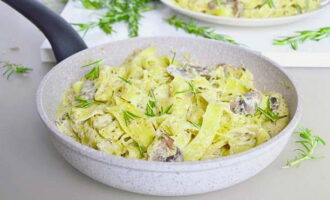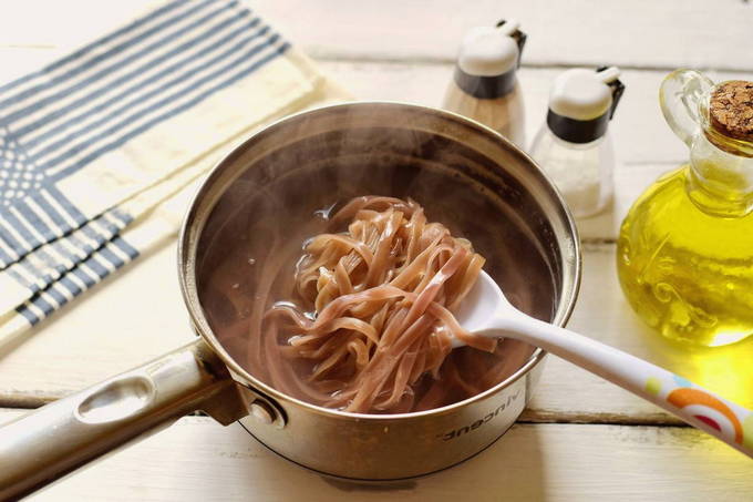 - Kook de fettuccine volgens de instructies op de verpakking. Doe de afgewerkte pasta in een koekenpan, roer.