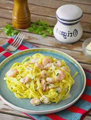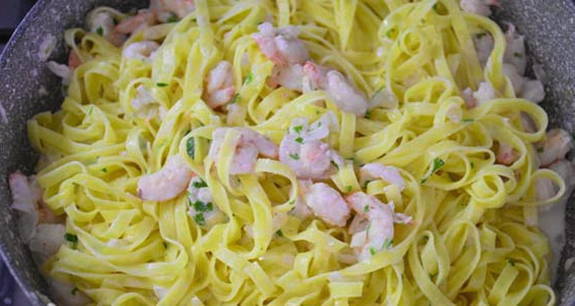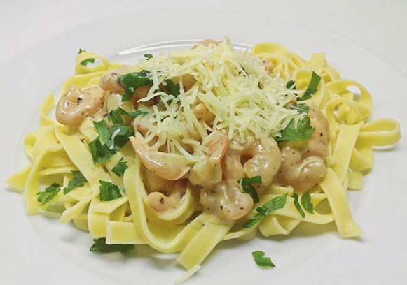 - Fettuccine pasta met garnalen in een romige saus