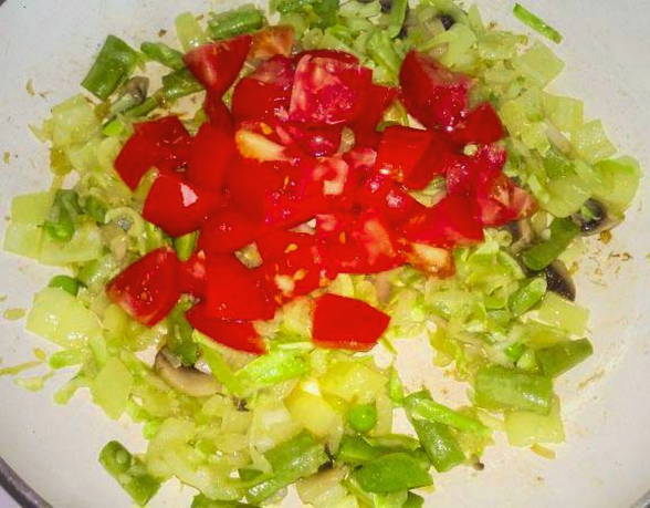 - Snijd de tomaten in blokjes en voeg toe aan de pan, blijf 3-4 minuten bakken.