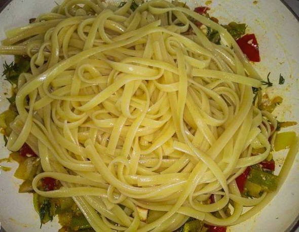 - Serveer warme fettuccine met groenten.