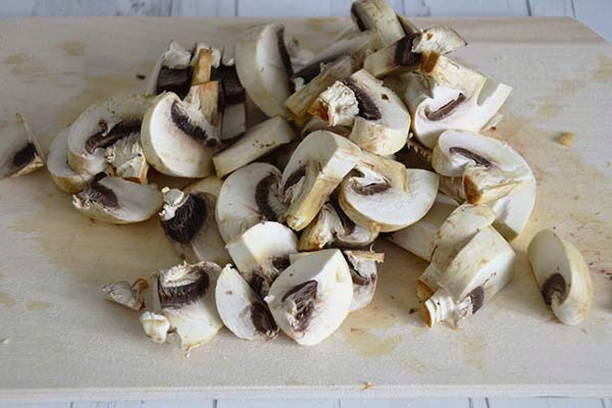 Snijd de champignons in kleine partjes.