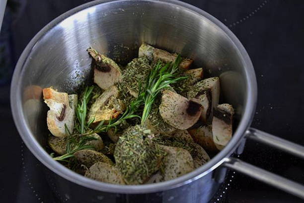 Doe de champignons in een pan, voeg een takje rozemarijn toe en kook 5 minuten op middelhoog vuur.