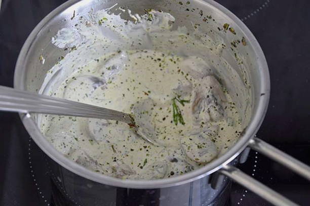 - Giet vervolgens de room erbij, breng aan de kook, voeg de gehakte kruiden toe, dek af en haal onmiddellijk van het vuur.