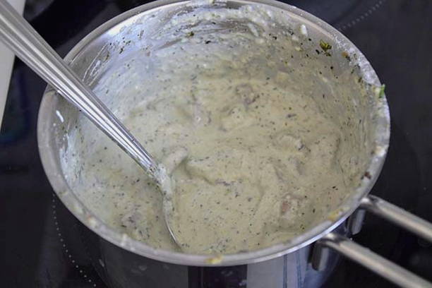 - Smelt de boter in een koekenpan, voeg room, bloem, zout, zwarte peper en gedroogde knoflook naar smaak toe, roer. Voeg vervolgens de geraspte kaas toe en verwarm de saus tot de kaas is gesmolten.