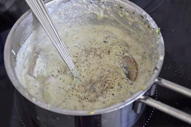 - Voeg vervolgens de room toe, breng de saus aan de kook, breng op smaak met zout en breng op smaak, roer en haal van het vuur.