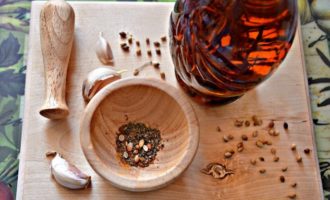 Demonteer de gepelde knoflook in plakjes, snijd ze elk in de lengte in 4 delen. Meng alle kruiden, giet in een vijzel en maal met een stamper. Als er geen vijzel is, maal dan in een gekochte pepermolen of in een koffiemolen. Giet de gehakte kruiden in een kleine kom, voeg de olijfolie toe en roer.