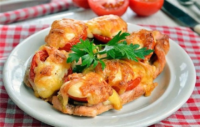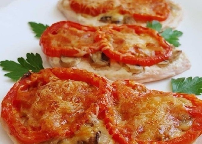 Een snelle versie van een vleesgerecht, gezond en voedzaam. Filet wordt gebakken met champignons (het is beter om champignons te nemen), tomaten en kaas, dit is een onsterfelijke klassieker. Je kunt een paar plakjes paprika toevoegen voor nog meer smaak.