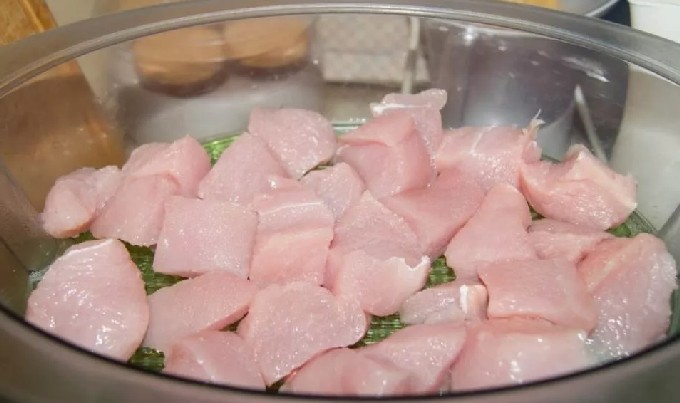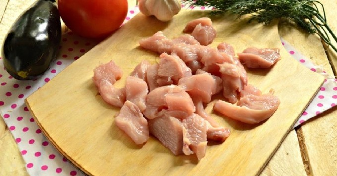 - Als de borst is gekocht, moet u de filet van het bot verwijderen, de films verwijderen en afspoelen, drogen met keukenpapier. Snijd het kalkoenvlees in kleine stukjes van ongeveer 3 bij 3 cm groot.