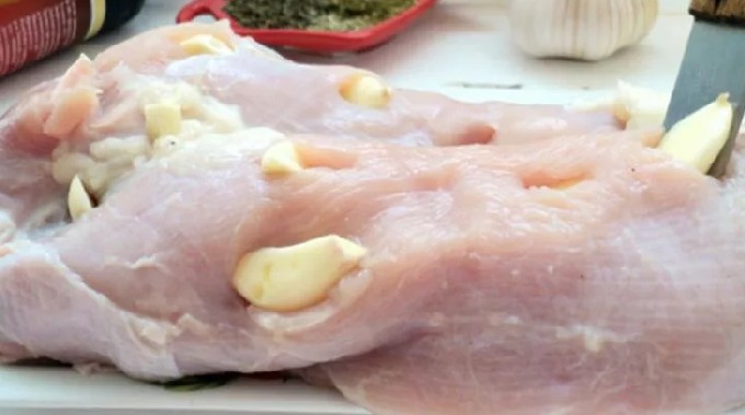 - Pel de knoflook, maak kleine inkepingen over het vlees op de filet en leg er kwartjes knoflookteentjes in.