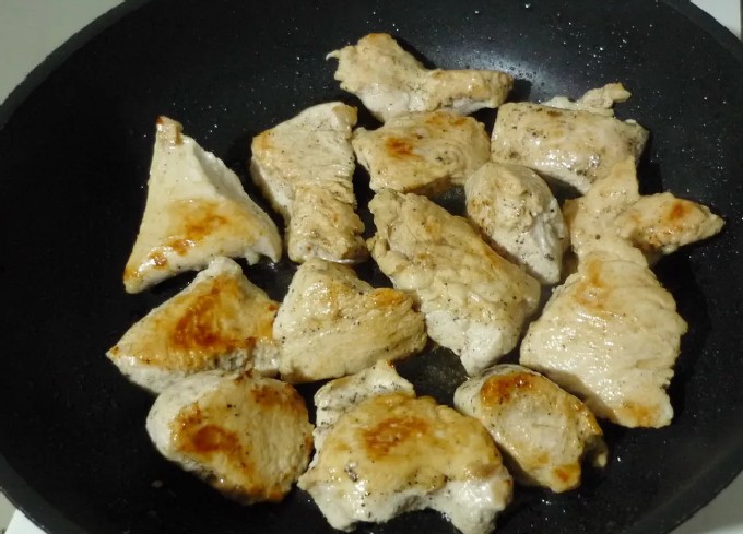 - Bak de stukken kalkoen aan beide kanten in plantaardige olie tot er een gouden, dichte korst verschijnt, die het sap van binnen afsluit.