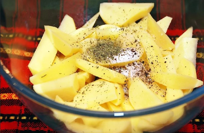 - Snijd de geschilde aardappelen in plakjes, giet in een kom, bestrooi met kruiden, knoflook en zout door een pers. Giet er zonnebloemolie in. Roer alles met je handen door zodat de kruiden gelijkmatig over de aardappelen worden verdeeld.