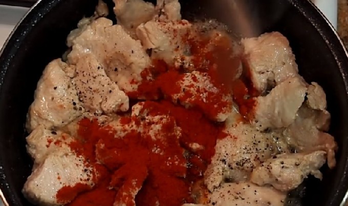 - Giet paprika en curry op het vlees.
