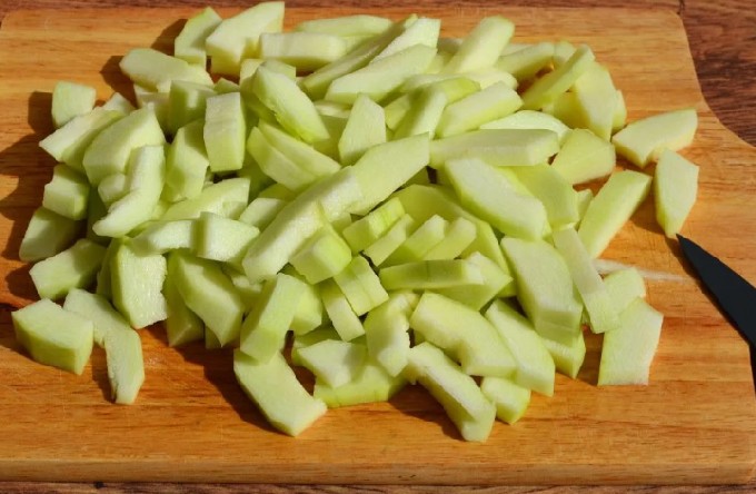 - Verwijder de schil van het groentemerg, verwijder het vruchtvlees met zaden, snijd in kleine blokjes.