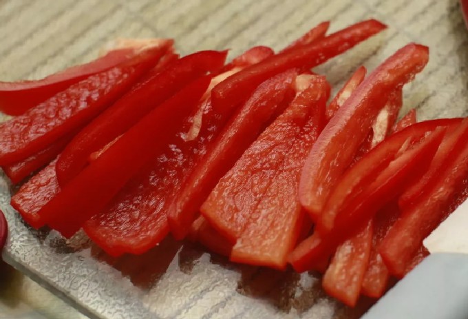 - Verwijder de zaaddoos en tussenschotten van de paprika, in reepjes gesneden.