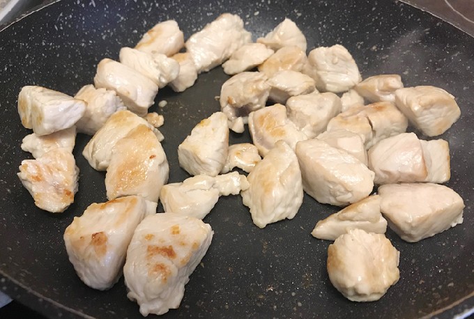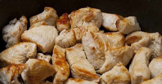 - Voeg olijfolie toe aan een koekenpan zonder handvat, bak de kalkoenstukjes op hoog vuur. Voeg daar champignons toe en kook ongeveer 15 minuten, tot al het vocht eruit is verdampt.