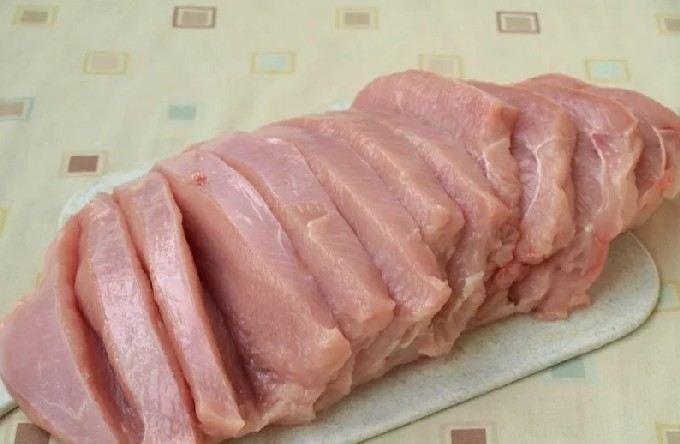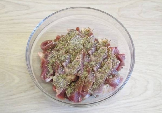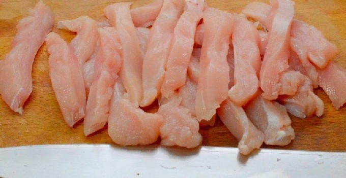 - Snijd het vlees in dunne reepjes van een halve centimeter dik. Zout de filet, breng op smaak met kruiden en leg ze op een bakplaat die eerder is ingesmeerd met zonnebloemolie (of bedek de bakplaat met een bakmat met antiaanbaklaag).