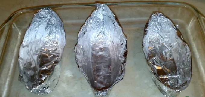 - Leg de stukken dijfilet direct warm op de folie op een bakplaat, elk stuk gevogelte moet zijn eigen stukje boter hebben.