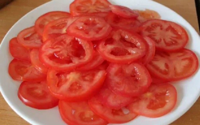 - Was de tomaten en snijd ze in dunne plakjes.