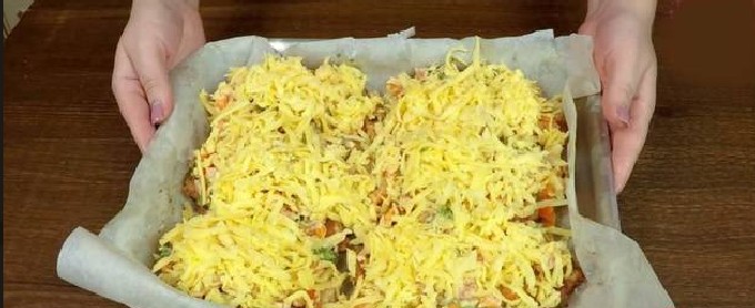 - Bedek de pan met folie en zet in een voorverwarmde oven op 180 graden. Kook het gerecht 25-30 minuten.