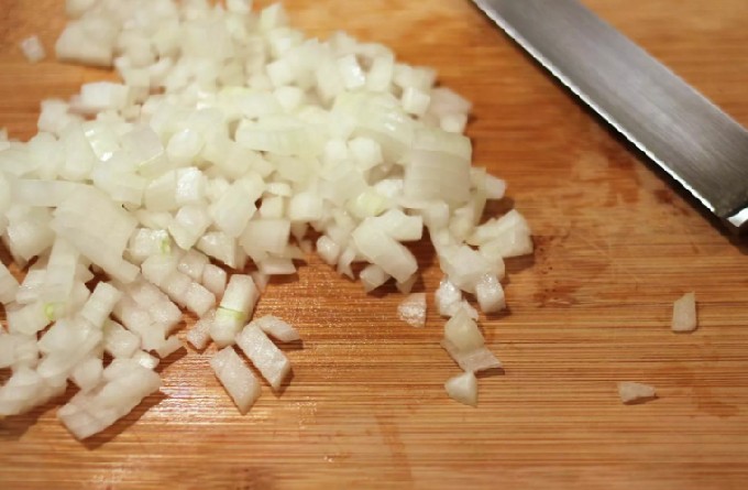 - Snijd de ui in kleine blokjes, spoel de champignons af, droog ze op een handdoek en snijd ze in dunne plakjes.