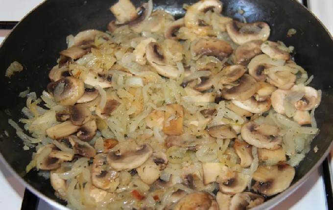 - Fruit de ui gemengd met de champignons in wat plantaardige olie (voeg een beetje zout toe). Rooster ongeveer 7 minuten. tot rooskleurig.