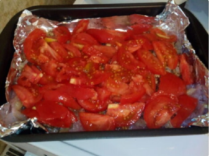 - Bedek een bakplaat met folie, die met een borstel licht ingevet moet worden met plantaardige olie. Leg de ingelegde kalkoenplakjes op een bakplaat, leg op elk plakje een tomaat.
