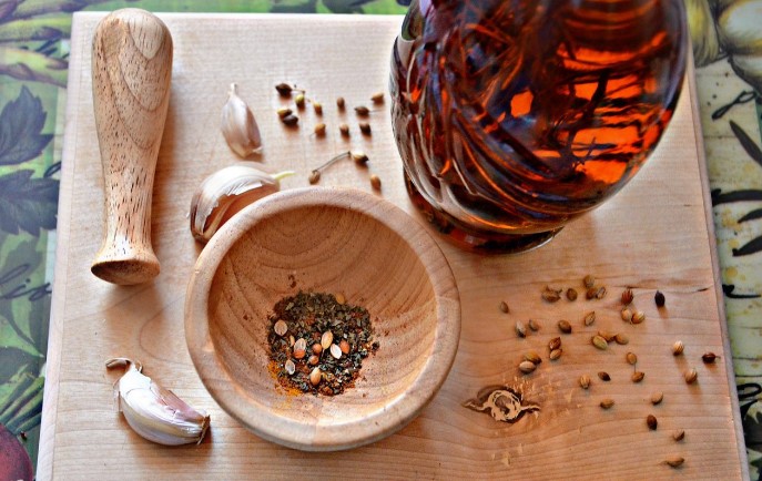 Demonteer de gepelde knoflook in plakjes, snijd ze elk in de lengte in 4 delen. Meng alle kruiden, giet in een vijzel en maal met een stamper. Als er geen vijzel is, maal dan in een gekochte pepermolen of in een koffiemolen. Giet de gehakte kruiden in een kleine kom, voeg de olijfolie toe en roer.