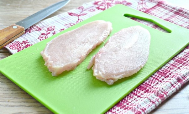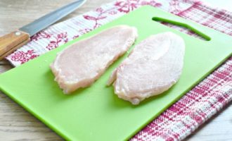 - Was de kipfilet en dep droog op keukenpapier. Als dit een borst is, is het noodzakelijk om het vlees voorzichtig van de botten te snijden en de huid van tevoren te verwijderen.