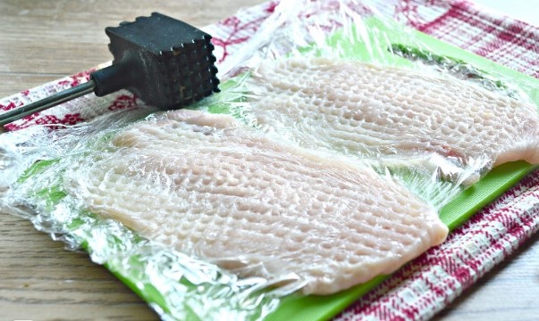 - Snijd de resulterende filet in middelgrote stukken. Leg vershoudfolie of een doorgesneden plastic zak op tafel, leg de stukken vlees erop, dek af met folie en klop voorzichtig los.