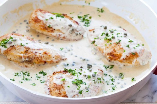 - Serveer de kipfilet met aardappelpuree, spaghetti of zelfgemaakte gekookte noedels, rijkelijk bestrooid met romige saus.