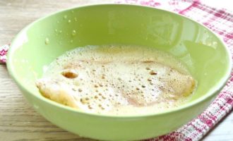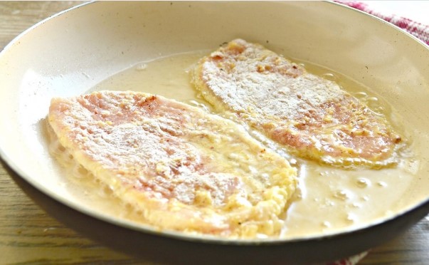 - Verhit een grote pan op hoog vuur met plantaardige olie.Neem een stuk kipfilet in je hand, giet 1 eetl. ik. beslag en, draai het om, doe het beslag in de pan. Doe hetzelfde met alle karbonades.
