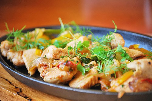 - Doe de blokjes kipfilet in een gebruikte koekenpan en bak ze ongeveer 7 minuten op middelhoog vuur, onder voortdurend roeren en keren. In dit stadium kunnen meer kruiden worden toegevoegd.
