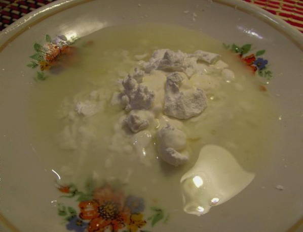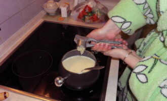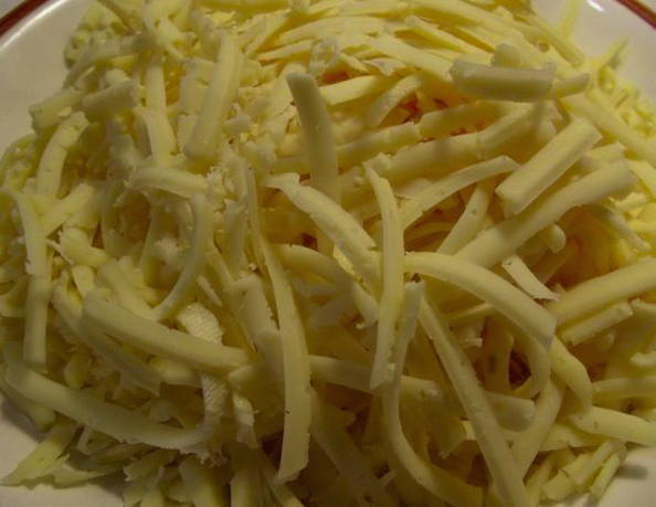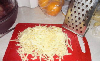 - De kaas moet van hoge kwaliteit zijn, niet gemaakt van plantaardige vetten, anders lost hij gewoon niet op. Rasp de kaas op een grove rasp.