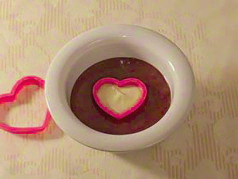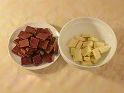 - Giet melkchocolade in de fondueschaal, plaats een vorm in het midden van de chocolademassa en giet er witte chocolade in.