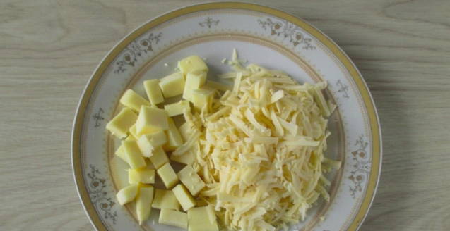 - Snijd de suluguni in blokjes, rasp de emmentaler.