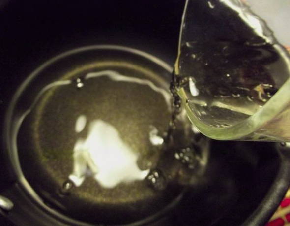 - Wrijf de binnenkant van de bodem en zijkanten van de pot in met een teentje knoflook. Giet wijn en citroensap in een pan, breng het mengsel aan de kook.