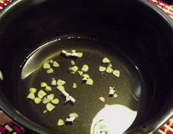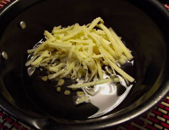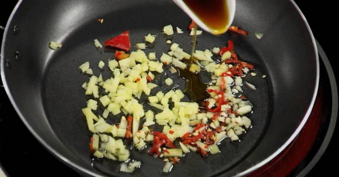 - Snijd de gember, knoflook en chilipeper heel fijn en bak ze in plantaardige olie.