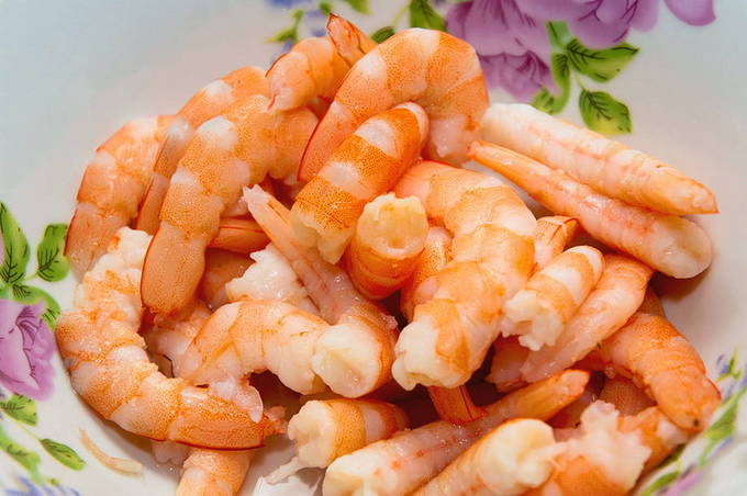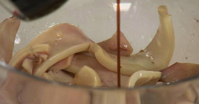 - Pel de garnalen en bedek ze ook met sojasaus. Giet de inktviskarkassen met heet water, schil ze, snijd ze in stukken en bedek ze met sojasaus.