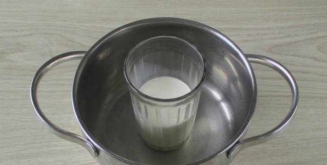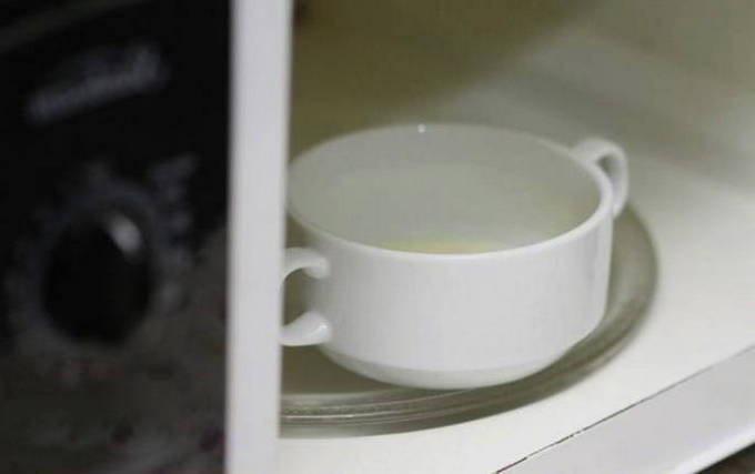 - Giet de melk in een kom en verwarm het krachtig in de magnetron, maar breng het niet aan de kook.