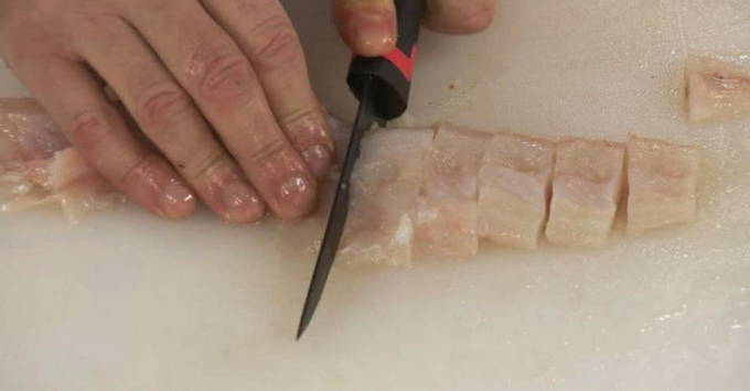 - Snijd de snoekbaars, verwijder de botten van de filet, snijd in kleine stukjes en marineer 15-20 minuten in sojasaus.