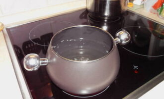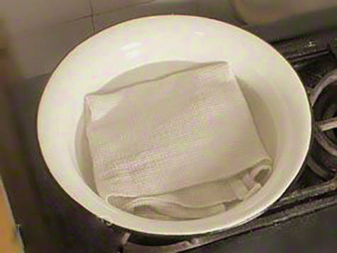 - Giet water in een grote kom, leg een handdoek of een doek op de bodem. Verwarm het water tot 70 graden.