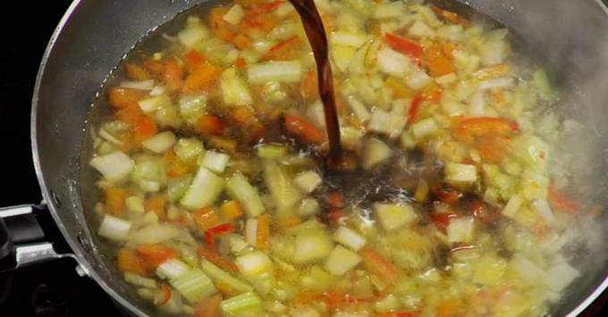 - Snijd de bleekselderij, ui en paprika in kleine blokjes. Doe groenten in een koekenpan, voeg suiker, water en sojasaus toe, laat sudderen tot de groenten zacht zijn.