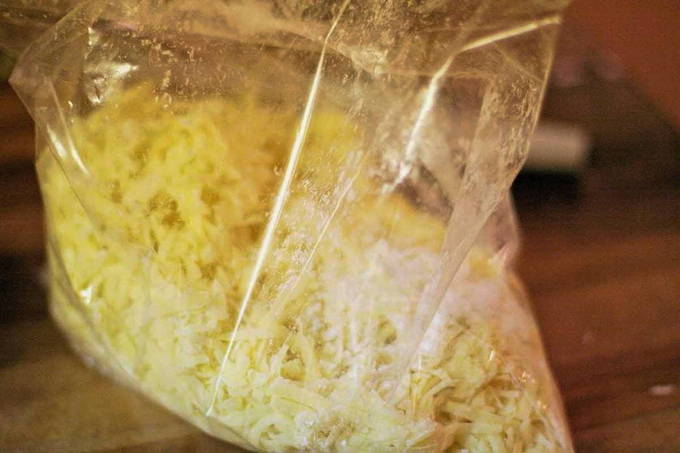 - Rasp de kaas op een grove rasp, doe het in een zak, voeg daar zetmeel toe. Sluit de zak en schud goed.