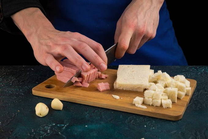 - Snijd de korst van het brood, snijd het vruchtvlees in blokjes. Snijd ook de ham in kleine porties.