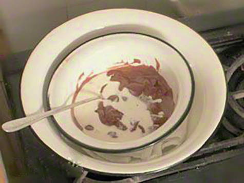 - Doe de melkchocolade in een kleinere kom, plaats de kom in het waterbad en smelt de chocolade, af en toe roerend. Giet daarna de room in de gesmolten chocolade, meng.