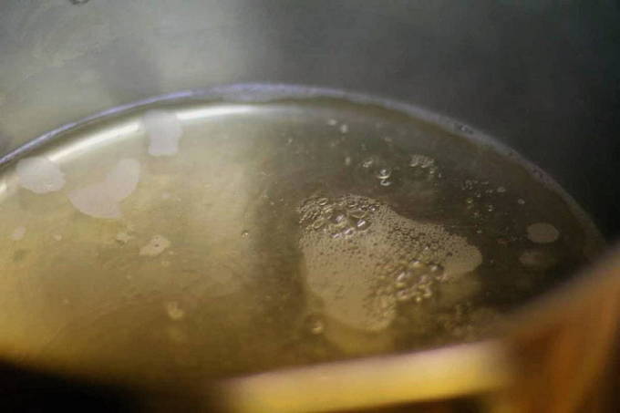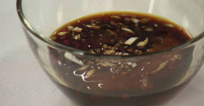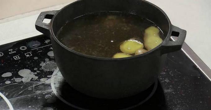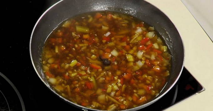 - Kook de bouillon op basis van de kop en de staart van de regenboogforel. Zeef het dan, voeg een paar eetlepels sojasaus, gember en chili toe. Haal de bouillon van het fornuis.