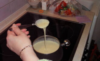 - Haal de pan van het vuur en voeg de room gemengd met de dooier toe aan de wrongel.