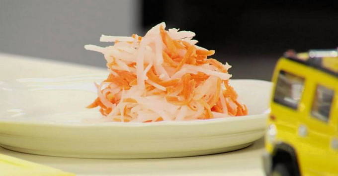 - Schil de daikon en wortel, rasp op een grove rasp, voeg sesamzaad toe en meng. Schep de salade op een grote schaal.