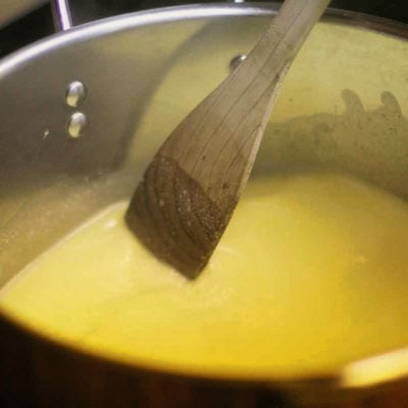 - Giet kaas in kleine porties bij warme wijn en roer. De kaas moet smelten.